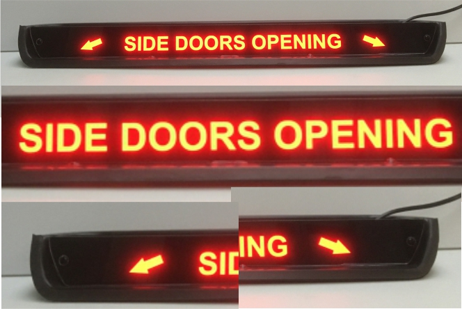 "SIDE-DOORS OPENING" rear window sign.